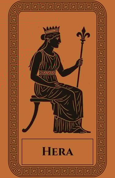 Hera, daughter of Kronos and Rhea, is the queen of the gods and wife of Zeus. She governs marriage, commitment, and the sanctity of vows. As matron of divine order, she embodies dignity, loyalty, and feminine authority. Yet her myths are filled with sorrow — for her union with Zeus, though sacred, was marred by his many infidelities. Hera’s jealousy and vengeance, often turned against Zeus’s lovers and their children, reveal the shadow of devotion betrayed.