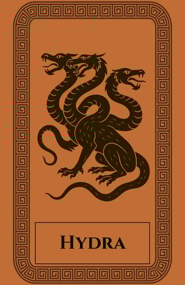 The Hydra was a monstrous serpent dwelling in the swamps of Lerna, with many heads — some myths say nine, others a hundred — and venom so deadly that even its breath could kill. Each time one head was cut off, two more would grow in its place. Heracles, in his second labor, was sent to slay the beast. Only with the aid of his nephew Iolaus did he succeed: while Heracles severed each head, Iolaus cauterized the wounds to prevent regrowth. From the Hydra’s blood, Heracles made the poison that would later wound Chiron, binding their fates in the cycle of pain and wisdom.