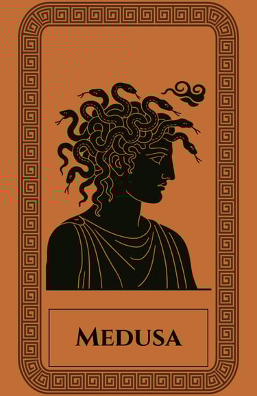 Before she became a monster, Medusa was a mortal woman — a priestess of Athena, devoted to purity and sacred service. When Poseidon violated her in Athena’s temple, the goddess punished not the offender but Medusa herself, transforming her golden hair into serpents and her face into a visage so terrible that any who looked upon it turned to stone.